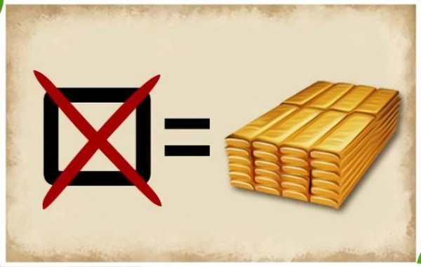 一个“口”字上面打了一个红色的叉叉。中间有一个“=”号,右边是一堆码起来的金条。