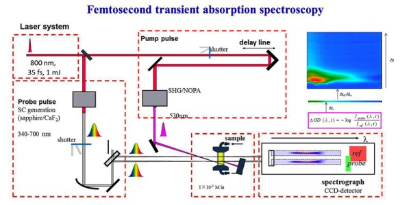 飞 秒 瞬 态 吸 收 光 谱 是 一 种 在 飞 秒 时 间 尺 度 上 的 时 间 分 辨 泵 浦 - 探 测(pump-probe)技术,因其时间尺度较短,该方法可以用于探测电子激发态的大部分信息,包括能量转移、电子转移、弛豫以及异构化等研究。该技术手段主要是先用一束泵浦光产生激发态,再用另一束探测光对瞬态中间物种进行吸光度的变化分析,两束光之间的时间延迟通过精细移动的马达延迟线来实现,0.3μm 的光程对应时间1fs。将所有不同延迟时间下获得的动力学特性整合起来就可以得到对应的光谱信息。我们课题组与中科院武汉物理与数学研究所张冰课题组合作测量飞秒瞬态吸收数据,我室超快装置正在搭建中。