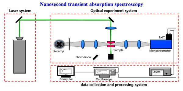 纳秒瞬态吸收系统最早由 R.Norrish 和 G.Porter 发展而来,该方法使用一束强脉冲氙灯激发分子形成激发态或自由基,另一束脉冲光来记录激发态和自由基浓度随时间变化的情况。纳秒时间尺度可以有效记录三重态、自由基及正负离子等反应中间体,因此该方法是研究光学反应的直接有效的光谱技术。如图所示为我室自主搭建的纳秒瞬态吸收装置,主要包括激发光源、探测光源以及信号采集及输出三部分。 激发光源——Nd:YAG 激光器,重复频率 10 Hz,输出初始波段 1064 nm,实验中还需进行二倍频、三倍频或四倍频,来分别获取 532、355、266 nm等常用波段来泵浦反应物。除此之外,图中所示染料激光器可以利用不同染料分子的荧光特性产生实际所需不同波段的激发光,以此就实现了泵浦激光波段的可调谐。 探测光源——探测光源为500 W的高压氙灯光强较强,之后经过两个透镜将探测光聚焦,经过样品池之后,再使用两个透镜将透射光收集进单色仪狭缝中。 信号收集系统——透射过样品的探测光被收集进入单色仪,根据实际探测光波段的不同,实验中使用的单色仪也是配置了两块不同参数的光栅。两块光栅的刻线数均为1200g/mm,不同的是一块光栅对应闪耀波长为300 nm,另一块为500 nm,有效的探测波段范围分别为 200-600 nm 以及 330-1000 nm。出射狭缝上连接光电倍增管(photo-multiplier, PMT),使用时需外加直流负高压,用来将探测得到的光信号转变为电信号并进行输出。同样,不同型号光电倍增管具有不同的响应波段,比如 CR131 型一般用在 185-900 nm,且对应高压直流一般不超过 1000 V。