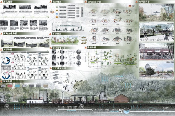在设计中,我们充分利用废弃厂房的原有结构,将其转化为可持续、智能化的多功能公共空间。这些空间包括造型景观桥、工业遗址展厅、中心水景广场等,成为人与自然、历史与未来、文化与科技交汇的独特场所。通过俯瞰图与分析图的展示,我们清晰地呈现了设计理念与实施路径,为项目的落地提供了有力的支持。