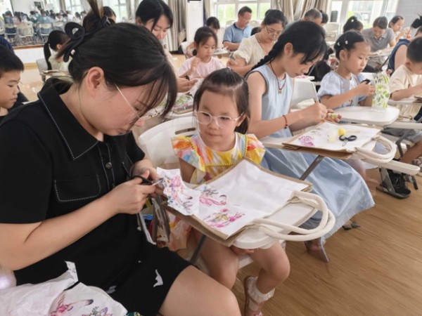 制作过程中,亲子间的协作格外暖心:有的家庭分工明确,孩子负责挑选图案排列,家长负责粘贴固定;有的家庭则一起动手,你涂胶水我贴贴纸,遇到贴纸起皱时,亲子俩一起轻轻抚平,脸上满是专注。经过一个多小时的忙碌,30 组亲子家庭陆续完成了自己独一无二的作品,大家手持亲手制作的蝶古巴特麻布包,在工作人员的引导下,用手机定格下这美好的时刻。