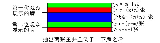 接着,表演者把两个人拿的牌收回去,这里的关键点是:收牌的时候一定要先放回第一个观众的牌,后放回第二个观众的牌。在收回的这叠牌里,两张王的位置分别变为了y-m和n+x,而两位观众展示的牌分别在第n张和第(m+n)张。表演者展开这叠牌,就可以看到两张王并数出y-m和n+x各是多少,而事先已经知道了x和y是多少,所以可以推测出两位观众各拿走了多少张牌(即m和n是多少)。
