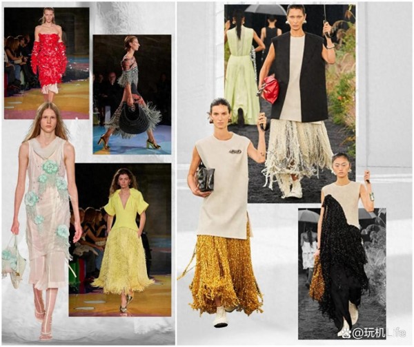 至于服饰风格方面,今年流苏元素的势头可以说是十分火热,以各种姿态出现于各大品牌的新品设计当中。而且相对于往年流苏元素仅作为点缀效果,今年许多新品的流苏量感显然会大很多,彰显出繁复张扬的特征。譬如BV的春夏新款通过多样的大面积流苏来呈现出灵动感,而Jil Sander新品的流苏与亮片叠加则是打造出精致华丽的观感,走起路来更为飘逸绚丽。