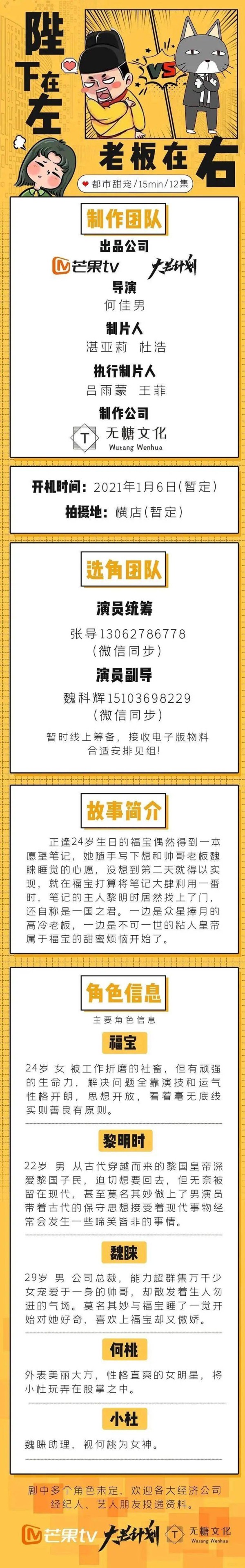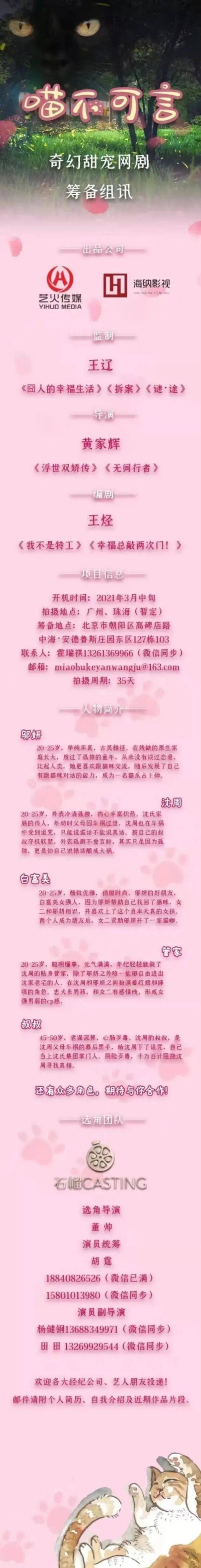 剧中多个角色未定,欢迎各大经纪公司、经纪人、艺人朋友投递资料。
