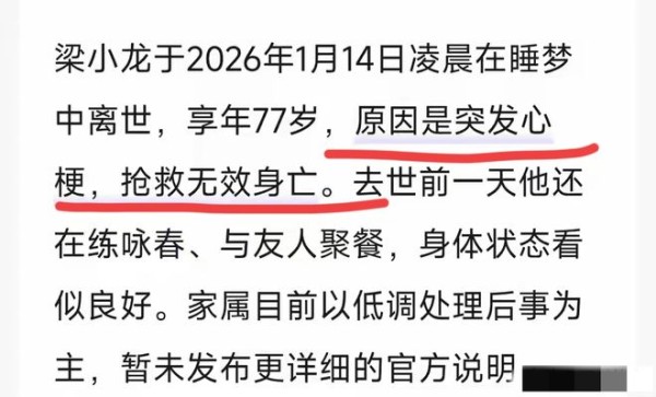 据知情人透露,梁小龙的离世源于突发心梗,事发于睡梦中,病情来得极为急促,家人来不及做出任何反应,虽第一时间送医抢救,但最终还是没能留住他。万幸的是,离世时他的至亲都陪伴在侧,或许是在睡梦中毫无痛苦地离去,他走得十分安详,也算给世人留下一丝慰藉。