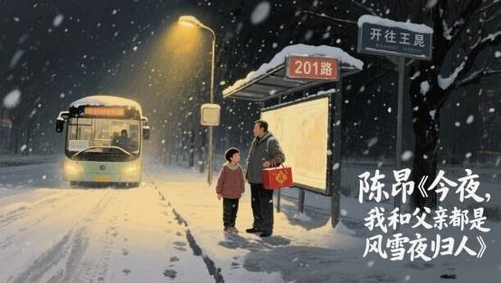 《今夜,我和父亲都是风雪夜归人》中“今夜,我和父亲,并肩等待着人间百味,今夜,我和父亲都是风雪夜归人”,是全诗的情感核心,将风雪夜归的场景升华为亲情的羁绊与人生的体悟。风的寻找、雪的歇脚、夜的笼罩,营造出寒冷而焦灼的氛围,末班车载满回家人的焦躁,接驳车的静默与之形成对比,凸显了归乡的急切。“雪花模糊着时光老人的鬓角”,暗喻岁月的流逝,而“我和父亲并肩等待”的画面,却温暖而坚定。“人间百味”既是对生活的概括,也是亲情的沉淀——风雪中,父子二人同为归人,并肩而立,让寒冷的夜充满暖意。