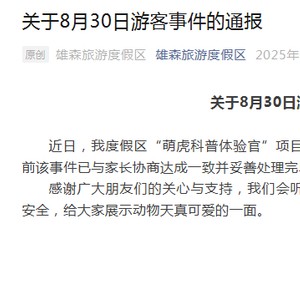 近日,我度假区“萌虎科普体验官”项目发生一起游客事件,受到社会各界的关注,目前该事件已与家长协商达成一致并妥善处理完毕。