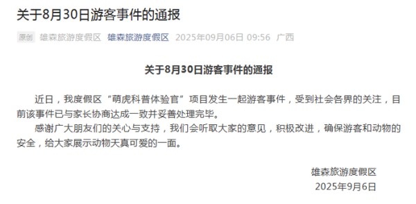 据此前报道,8月30日下午,贵港市平南县雄森动物大世界内发生一起意外事件,一名7岁女童在参与“萌虎科普体验官”付费项目时,被小老虎咬伤右小腿。双方就善后处理问题产生分歧,相关部门介入处理。(此前报道)