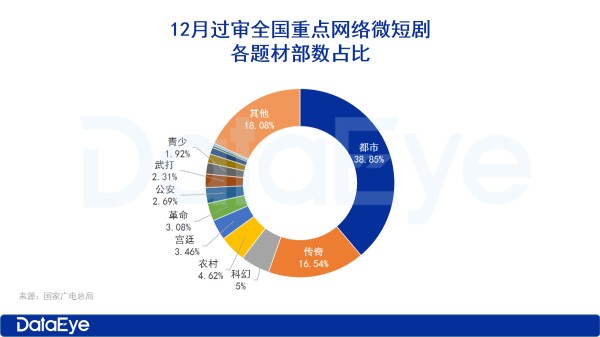 与11月相比,都市和传奇题材稳居领先地位,且占比较上月均有所提升,分别达38.85%与16.54%。此外,科幻、农村、革命和公安等题材占比则有所下降。