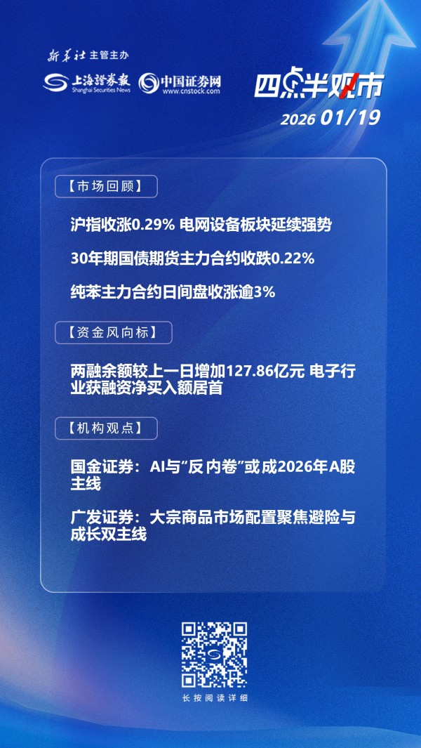 1月19日,A股市场整体横盘震荡。截至收盘,上证指数报4114.00点,涨0.29%;深证成指涨0.09%,创业板指跌0.70%,科创综指跌0.21%。沪深两市合计成交2.71万亿元,较上周五缩量3179亿元。盘面上,全市场超3500只个股上涨。电网设备概念延续强势,保变电气、中国西电、广电电气等多股涨停。机器人、贵金属、旅游酒店板块同样涨幅居前。