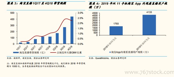 淘宝直播迅猛发展,抖音和快手直播带货量级也不容小视。在讨论网红直播带货时, 不得不提淘宝直播。背靠淘宝强大的电商流量基础,真正在内容、流量和玩法上有重大升级发生在 2017 年。相比早些年从微博上发图片和文字的网红,2017 年在短视频强势扩张下诸多网红冒出速度变得更快,传播范围也变得更广,对淘宝直播又有很强的流量反哺作用。而淘宝直播也有意培养或扶持出一批网红,李佳琦是其中受益一位。2018 年淘宝直播带货规模超千亿,同比增速达 350%。抖音和快手除了拥有孵化网红的流量优势外,自身带货规模的成绩也不错。2018 年 4 月,快手小范围内测“我的小店”,6 月与有赞合作推出“短视频电商导购”,并新增“快手小店”,同时推出“魔筷 TV”小程序,引导用户一键跳转完成购买。2018 年5 月,抖音则上线了店铺入口。2019 年可以说是直播带货爆发的一年。2019 年,淘宝直播“618”截至 15 点 30 分成交规模为 130 亿元。根据QuestMobile《2019 双 11 洞察报告》,手机淘宝 App 内观看直播的用户规模为 4133 万,同比增长 130.5%。而双 11 淘宝直播成交规模为 200 亿元,其中有超过 10 个亿元直播间,超过 100 个千万元直播间。