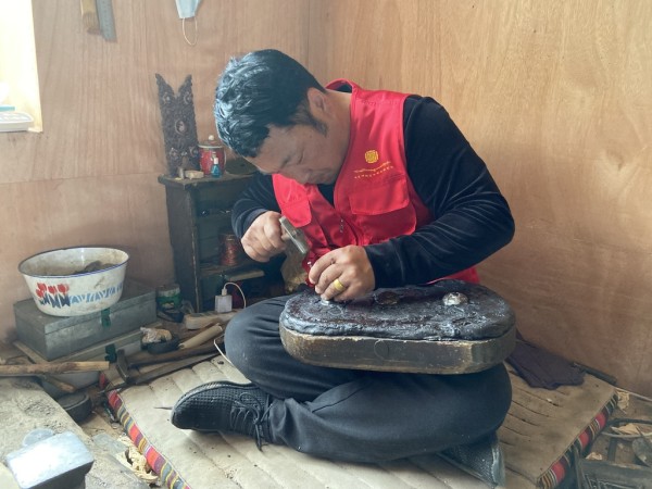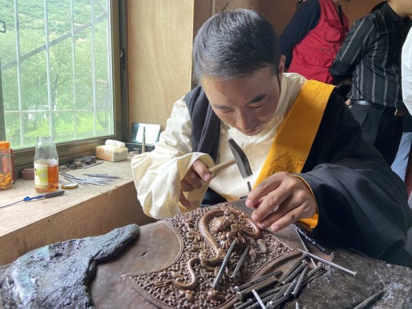 在河坡镇普马村二组俄色呷玛文化艺术传习苑,50岁的大哥扎西绒布和老二根秋单真正在“叮叮”打造金属手工艺品,弟弟其美在楼上带着几个徒弟,细致地描绘唐卡。三个儿子从小在父亲的教育和承陶下学习和制作手工艺品,现在已都是省级或州级非遗文化传承人。