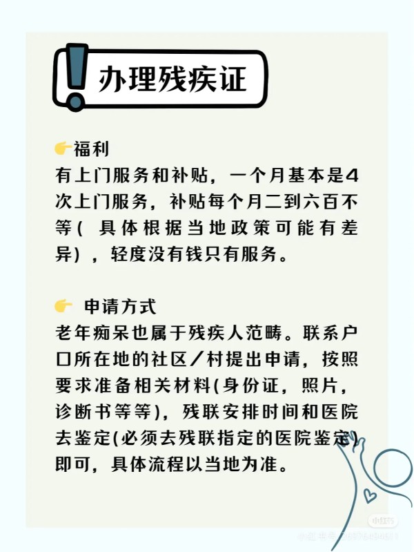 阿尔茨海默症患者可申请精神类残疾证,享受残疾人生活补贴、护理补贴及康复服务。部分地区将认知障碍纳入残疾评定范围,凭诊断证明可申请相关补贴,缓解家庭经济压力。