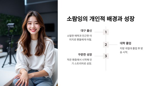 소람잉은 대구 출신으로, 지방에서 올라온 소탈한 매력과 친근한 이미지를 갖추고 있습니다. 그녀의 진솔한 성장 이야기와 경험은 많은 팬들에게 공감을 불러일으키며, 소람잉만의 특별한 방송 매력을 이루는 요소로 작용합니다.