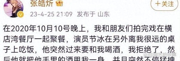 一位鲜为人知的女制片人,一个知名度不高的老戏骨,一杯酒,却引发了一场娱乐圈的轰动。节冰,曾在电视剧《心居》和《龙城》中表现出色,却鲜有包装和营销,微博粉丝数量也不多。张皓炘的曝料后,节冰选择沉默,并继续宣传自己的作品,似乎对这一事件不以为然。