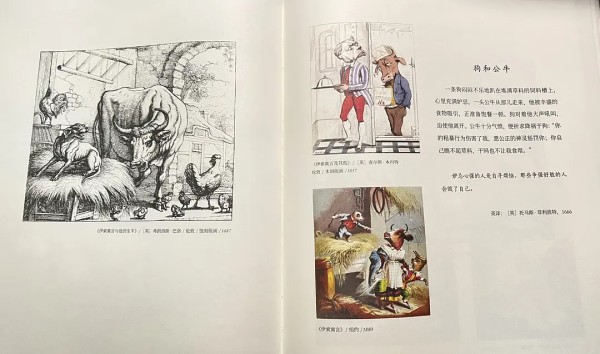 1、多变而又夸张的动物造型插画比文字描述来得更为直观,想要率先吸引读者的注意力,率先引发孩子的兴趣,那么,一些旗帜鲜明的形象必定能让大家产生阅读的欲望。比如单篇故事《狗和公牛》中,你可以看到1687年到1880年间对狗和公牛两种动物形象的不同绘画表现,都是旨在更加贴合寓言本身,表现嫉妒心强和争强好胜的人的特殊写照。