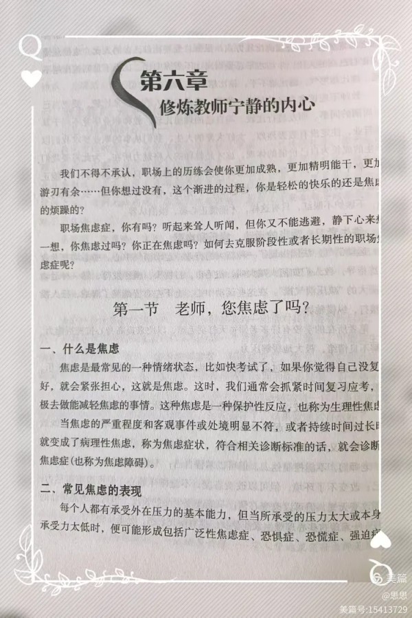 点亮心灯,从“心”出发。书中开篇写道:“教师不仅是知识的传授者,更是孩子心灵的引路人。”这句话如晨钟暮鼓,唤醒我对教育本质的深层思考。作为幼教人,我们的心理状态不仅关乎自身幸福,更深刻影响着孩子们的情感世界与人格成长。