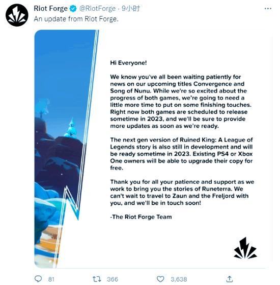 拳头游戏官方宣布,旗下多款游戏将延期发布,以确保游戏质量的进一步优化。特别是备受期待的冒险游戏《聚点危机:英雄联盟外传》以及《努努之歌:英雄联盟外传》(含次世代主机版本),官方决定将它们推迟至2023年与玩家见面。