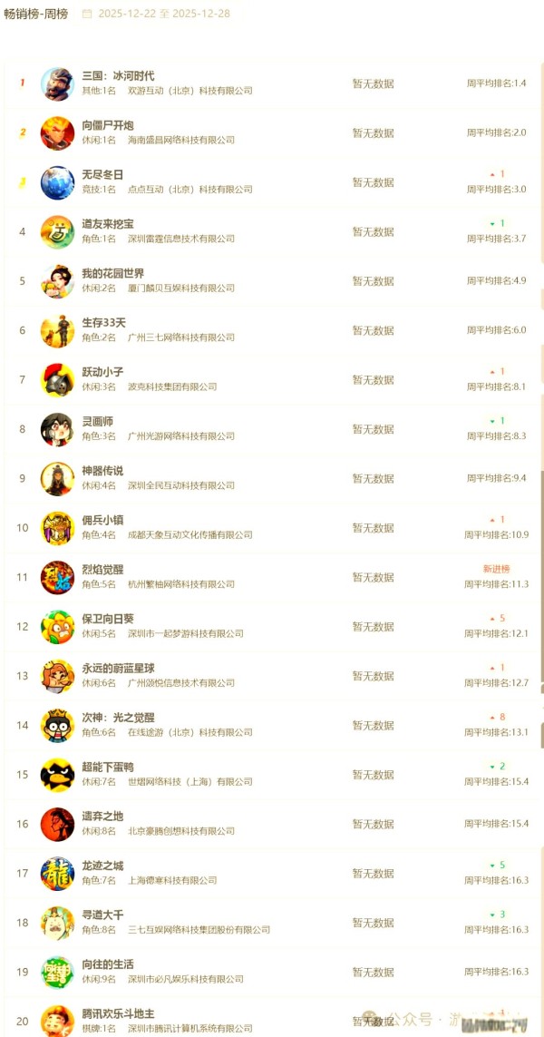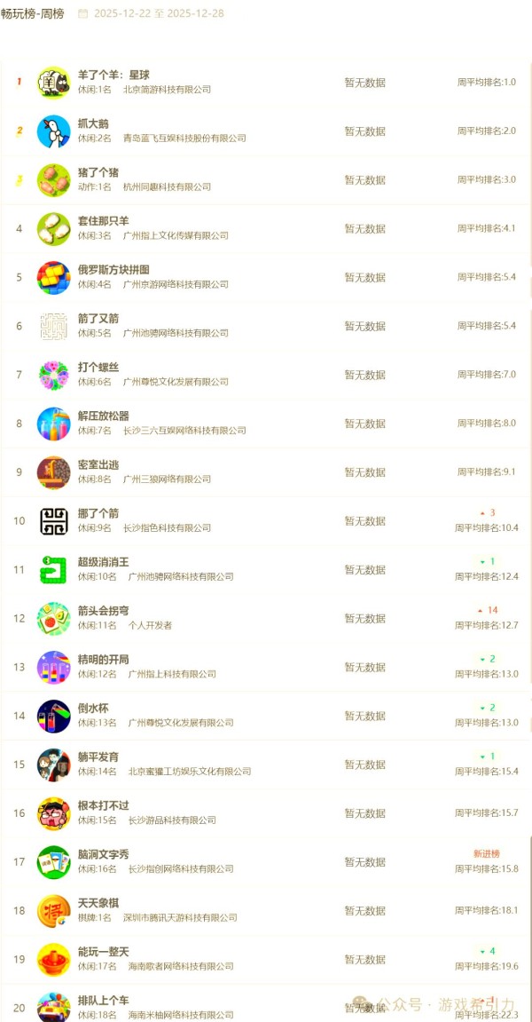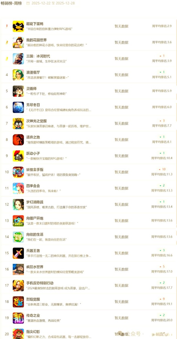 本周畅销榜上,《超能下蛋鸭》成功重夺榜首,整体排名变动不大。值得注意的是,《妖怪金手指》逆势上涨10名,跻身Top 10之列,展示了放置挂机类玩法在年底冲刺阶段的营收爆发力。