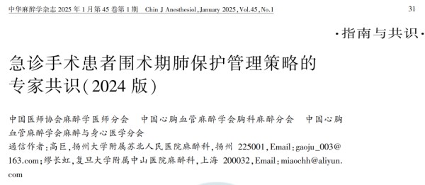急诊手术患者常面临失血性休克、吸入性肺炎等导致术后肺部并发症的高危因素,需要精准实施围术期肺保护管理策略。本共识由多学会专家组成委员会,基于德尔菲法,检索相关文献制定,涵盖术前、术中、术后管理及特殊急诊患者的 22 条推荐意见,如术前评估风险、优化通气氧合,术中采用小潮气量通气、个体化滴定 PEEP,术后合理使用肌松药拮抗剂、优化氧疗等,为临床实践提供参考。