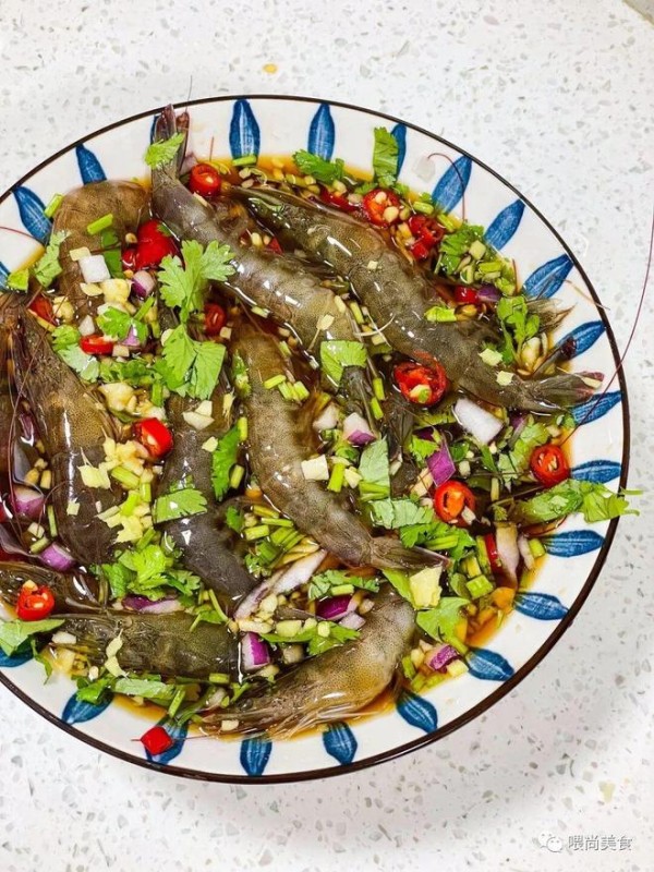 2、把腌制好的大虾沥干,倒入料汁,放进冰箱冷藏一小时即可。