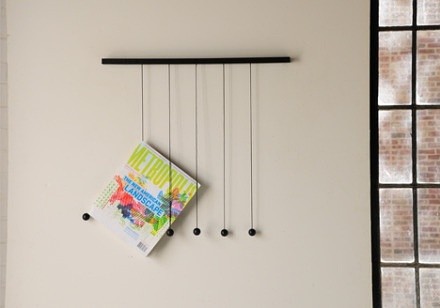 书架,每根线下面挂一个小球,利用墙体和线底部小球的支撑来完成书架的使命,且不会占用过多的空间。将书翻开,像使用书签一样将线置于书本中,倒挂,一个漂亮的书架就出现在墙体上。