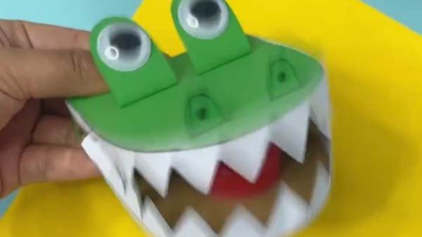 用废旧纸壳和瓶盖来做一只嘴巴会动的鳄鱼吧!