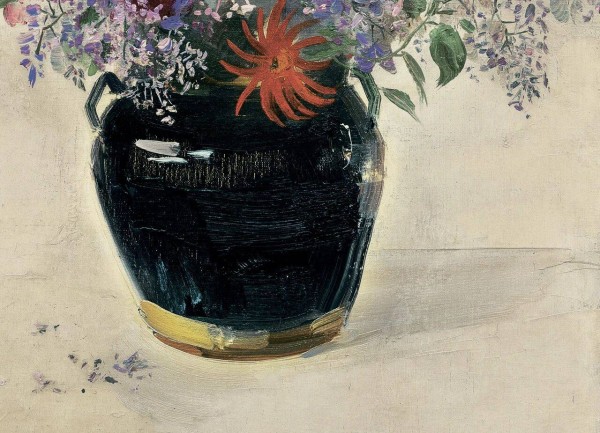 作品没有复杂的背景,只有几瓣落花与极淡的影,这“留白”恰是东方美学最自信的表达,不解释,不填满,画中紫色丁香如烟霞朦胧,桌面隐去,只留几片落花与浅影,满满东方留白的韵味。花瓶平涂宁静,花枝松散恣意——吴冠中笔下的中西融合,温柔又坚定。让你听见花开的声音,闻到时光拂过的气息。