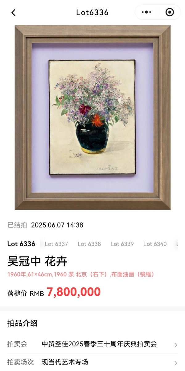 吴冠中这幅1960年花卉油画,2025拍卖以780万落槌,加佣金897万成交,虽略低于2018年的920万,却依然拿下2025年吴冠中拍场最高价。