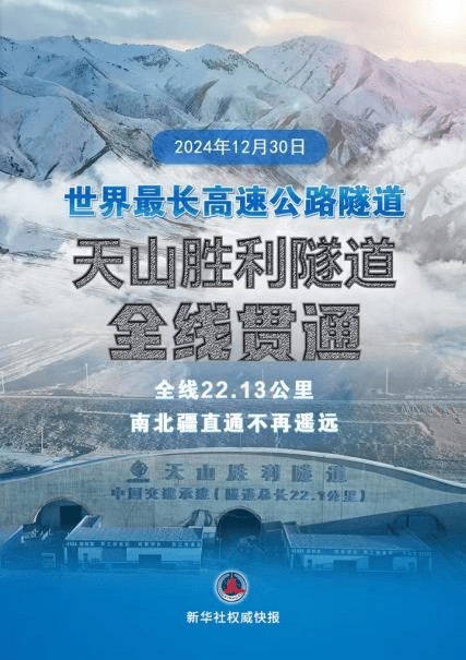 2024年12月30日11时许,天山深处传来欢呼声, 世界最长高速公路隧道——天山胜利隧道全线贯通。