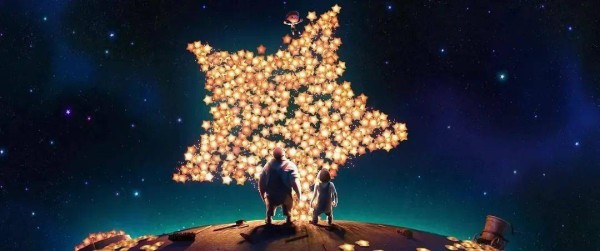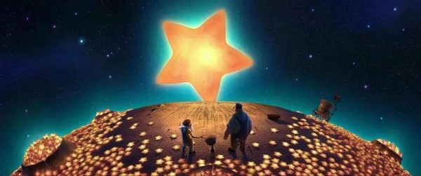 面对这样的庞然大物,两个大人用尽了各种方法,都无济于事。就在他们争论不休时,男孩从工具车里拿了一把小锤头,悄然爬上星星,然后用锤头轻轻地一敲,巨大的星星瞬间化作一颗颗小星星……