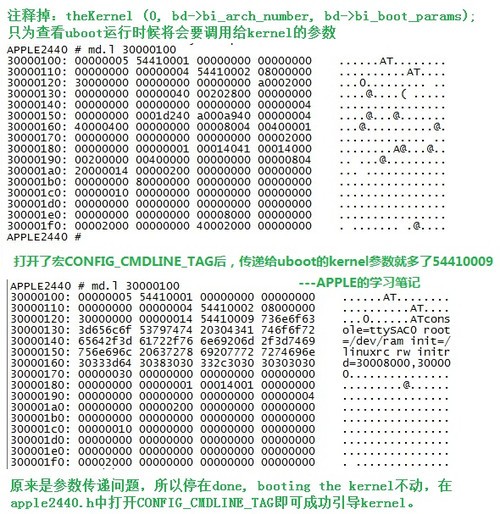 7,于是开始关注这些TAG及地址0x5442000x等。在apple2440.h中添加了宏开关后终于解决了问题。不过暂时发现CONFIG_INITRD_TAG定义了没有用。而我之前CONFIG_SETUP_MEMORY_TAGS宏是开了,但是CONFIG_CMDLINE_TAG没开,打开后,就能引导kernel了。
