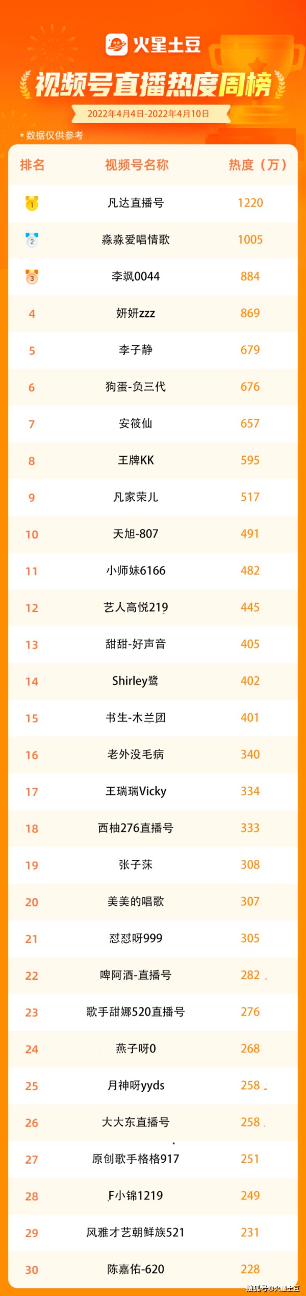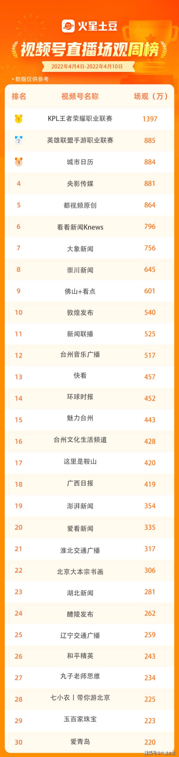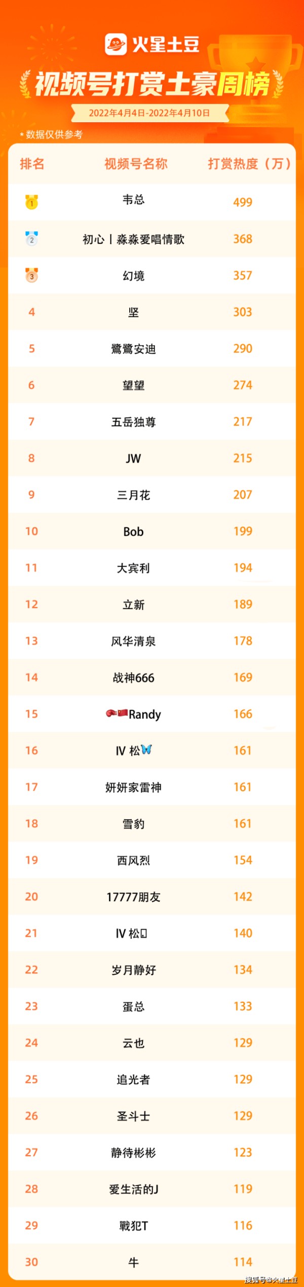 注:榜单统计时间为4月4日至4月10日,源自火星土豆对公开数据的统计与整理,不代表微信视频号官方观点。