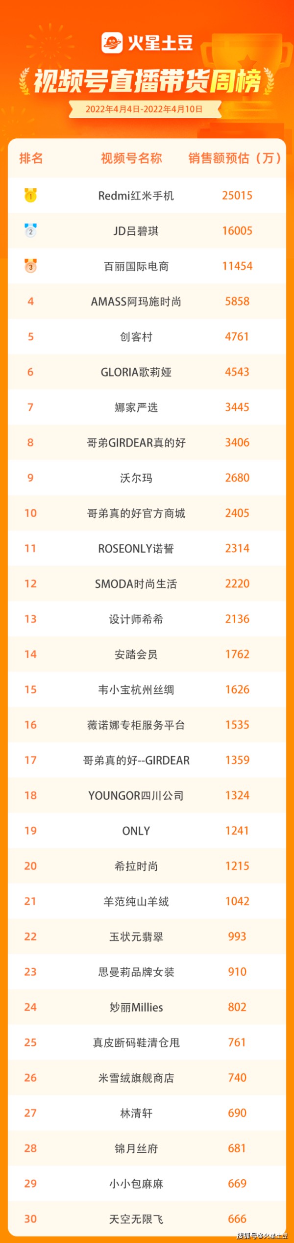 专业视频号数据分析工具火星土豆独家视频号周榜:品牌自播成爆款