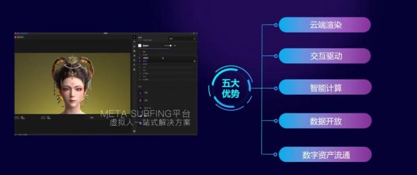 在完善AI智能生成虚拟形象技术的同时,天娱数科紧紧依托数据、算法、场景三大核心优势,聚焦全真互联网应用场景,集成三维重建、渲染、光线追踪、深度学习超级采样、姿态表情模拟、高保真视频流压缩等自研算法,推出了Meta-Surfing元享SaaS平台,为用户在元宇宙中的数字身份塑造、元世界打造提供数据与算法服务,实现了云端渲染、交互驱动、智能计算、数据开放与数字资产流通。通过平台内置的面部表情实时驱动技术、光线智能追踪与分布式智能云端渲染三项辅助智慧功能,真正实现了高精度模型在直播中的低延时与人场高度融合的完美结合。