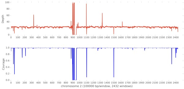 上面的两张图都比较丑,下面表示覆盖度和测序深度的图还算凑活。通过depth我们能够发现测序深度在整个染色体上比较均匀,为20X多。通过coverage我们可以看出,整条染色体的大部分都被reads覆盖到了。这种表示方法远比单纯告诉你测序深度多少要靠谱的多,你不仅能够看出染色体每个区域的测序深度,还能看到测序覆盖到的区域,很直观,不用列一堆数据在那,表示的信息量却相当丰富。这就是图的意义所在。