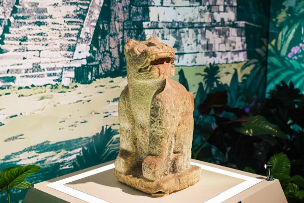 美洲豹型旗座。在序厅部分,一件“美洲豹型旗座”造型独特,在玛雅金字塔背景图片的映衬下,呈现出别具一格的神秘感。这件出土于奇琴伊察圣井的美洲豹型旗座,承载了玛雅宇宙观中“冥界太阳”的象征。太阳在夜晚化身为一头通体斑纹的美洲豹,穿行冥界,以爪牙撕裂黑暗、以呼吸催动黎明,最终蜕变为重生的朝阳,融合了死亡、混沌与希望之意。