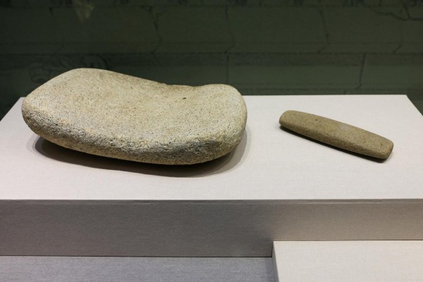 在生产生活中,玛雅人以玉米种植为核心,建立了高度集约的农业体系。展览中展出了两件来自墨西哥国家人类学博物馆的石磨盘则代表了这种日常生活。玛雅人自称为“玉米的儿女”,玉米是他们最重要的主食。他们通常会将干玉米粒浸泡在石灰水中以软化并脱皮,随后加热煮熟,再使用石磨盘和磨棒将碱化后的玉米粒研磨成粉,最后与水糅合成玉米面团。石磨盘与磨棒不仅是制作玉米食物的必备工具,同时也是重要的祭祀器具。