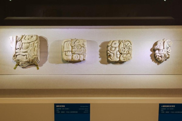 文字体系是玛雅文明最卓越的成就之一。本次展览就展出了玛雅的象形文字石板、刻有象形文字的石灰岩王座等珍贵文物。玛雅文笔画复杂,不仅有直线,还有曲线、点、圆圈等,对事物的描绘更细致,更像一幅小图画。字形规整,整体偏方或圆,大小均匀,排列整齐,外轮廓清晰,像装在格子里一样。形象具体,细节丰富,比如画动物会仔细表现羽毛、眼睛等。