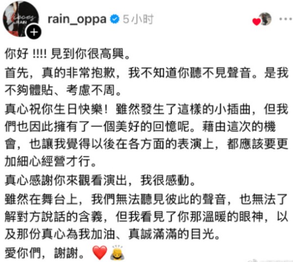 随后,该粉丝在其社交平台透露自己有听觉障碍,表示当时没有听懂Rain说什么,不是“不听话的粉丝”。随后,Rain用中文回复并向她道歉:“是我不够体贴,考虑不周”。此外,Rain还表示:“虽然我们无法听见彼此的声音,也无法了解对方说话的含义,但我看见了你那温暖的眼神。”