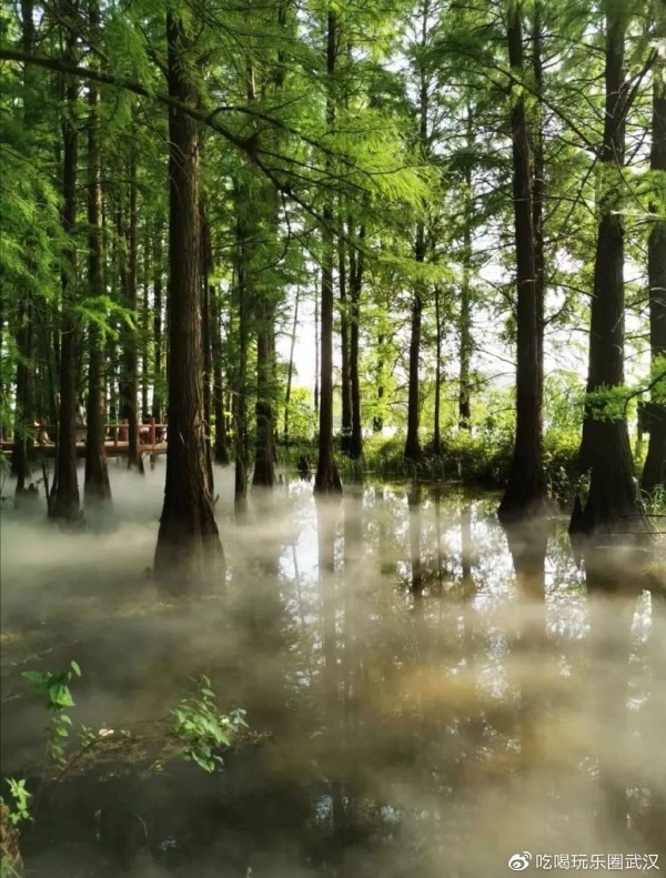东湖落雁景区,美得令人心醉!漫步林间,踏上九曲桥,水杉栖于栈桥两旁,一路遮天蔽日,光影交错,水雾飘散,宛如迷雾森林、人间仙境,氛围感简直不要太强!