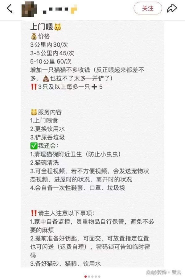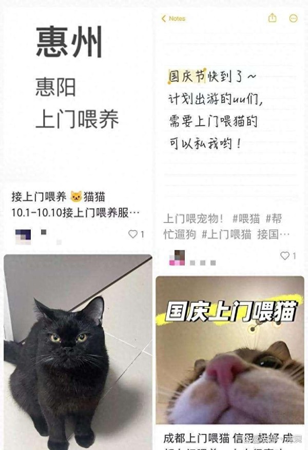 关于宠物托养这块,法律人士也提醒大家:上门照顾宠物这事儿其实有可能闹出不小的纠纷,还是建议找专业靠谱的“宠托师”比较保险。在社交平台上,可以看到许多帖子,国庆假期本地的上门喂宠业务供不应求。记者最近刷了下各种平台,比如58同城、闲鱼这些,在北京、上海、厦门等城市的上门喂猫服务价格标得很明白。通常是按距离来的,比如3公里以内30元一次,5公里以内就40元,每多一只宠物加收5元。除了春节之外,其他节假日价格基本没啥变化。