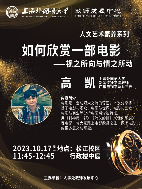 电影是一套与观众交流的语汇。本次分享将基于电影与观众、电影与世界、电影与艺术、电影与商业等分析电影媒介独特性。用《封神第一部》《消失的她》《保你平安》等电影,带大家踏上电影欣赏之旅,探求电影的更多意义与可能。