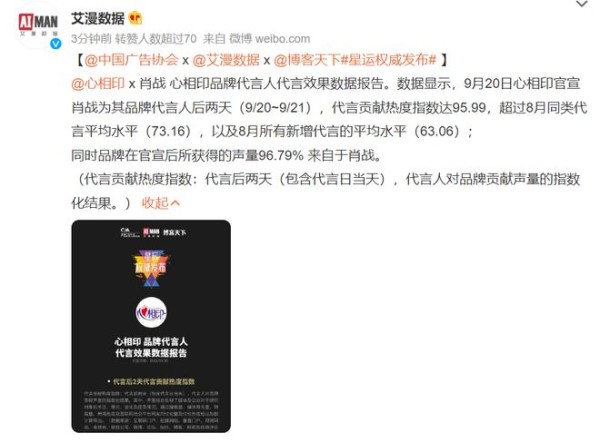 9月22日,权威数据网站艾漫数据联合中国广告协会和博客天下发布了肖战成为心相印品牌代言人代言效果数据报告。其中数据显示,肖战代言之后两天内代言贡献热度指数高达95.99,超过8月同类代言平均水平的73.16,也远超8月新增代言的平均水平63.06。