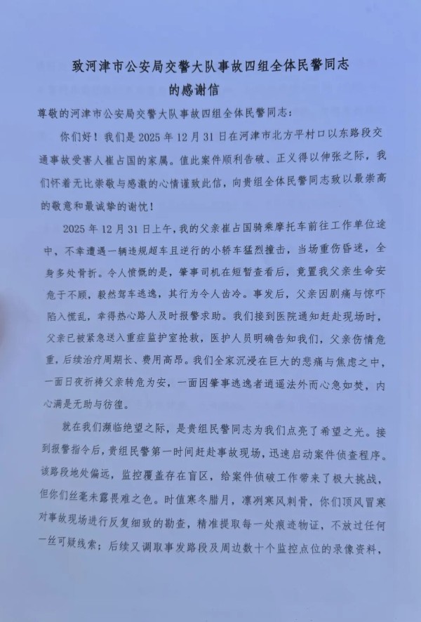 “破案过程中的每个细节,都体现了交警同志的责任心和专业能力。”崔某家属表示。