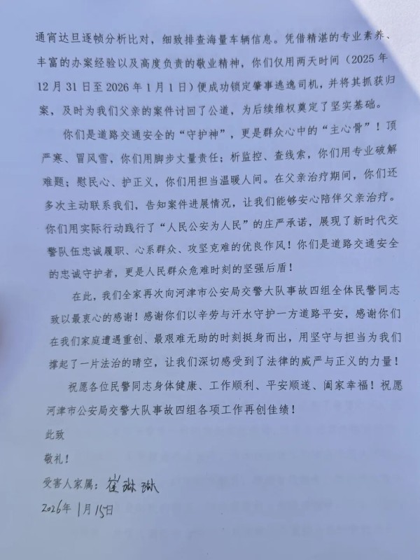 2026年1月15日,河津市公安局交通管理大队迎来了一位特殊群众——她将一面印有“神速破案 尽显警威,秉公执法 为民解忧”的锦旗及一封感谢信送至河津交警大队,专门感谢事故中队民辅警不辞辛苦,侦破肇事逃逸案件,将肇事者绳之以法。