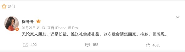 近日,演员徐冬冬因家人病重,决定将原定于2月26日举办的公开婚礼临时简化,改为仅与家人朋友的低调聚餐,婚纱仪式则推迟举行。与此同时,她通过社交平台明确表态,此次婚礼拒收一切礼金与礼品。徐冬冬在发文中强硬表示:“无论家人朋友,还是长辈,谁送礼金或礼品,这次我会请您回家。抱歉,但感恩。”