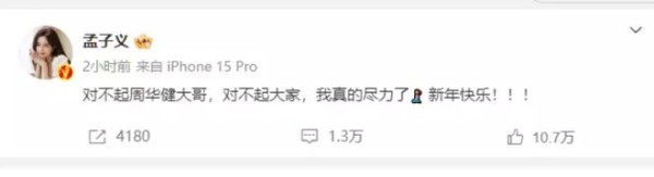 据悉,当晚周华健和颜人中、孟子义、刘令姿、曾可妮、李好、刘维合唱歌曲《让我欢喜让我忧》,合唱中,孟子义的音调与其他人差别巨大,甚至可以在众人的大合唱中明显凸显出来。当天晚间,孟子义在社交平台上发文回应道:"对不起周华健大哥,对不起大家,我真的尽力了,新年快乐!"