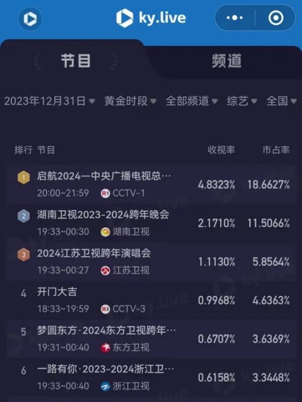 据羊城派报道,零点过后,收视率统计即时性最强的酷云数据出结果了。当晚,央视跨年晚会以4.83%的收视率拿下断层第一,湖南卫视跨年晚会以2.17%的收视率位居卫视第一,江苏卫视以1.11%拿下卫视第二,东方卫视以0.67%拿下卫视第三,浙江卫视以0.62%拿下卫视第四。