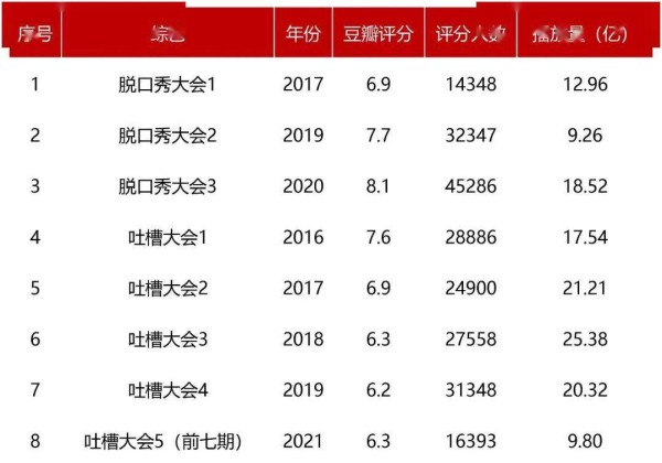 虽然目前近播出七期,但播放量同样不温不火,《吐槽大会》前四季的播放量分别为17.5亿、21.2亿、25.4亿、20.3亿。目前《吐槽大会5》播出过半,播放量9.8亿。